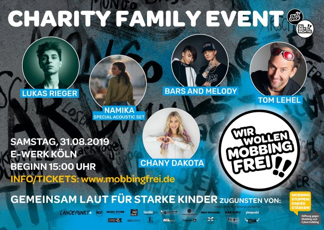 „Wir wollen mobbingfrei!!“ – Musik- und Internet-Stars machen sich stark gegen Mobbing: Im Kölner E-Werk findet das große Charity-Event gegen Mobbing statt. Zu den Acts zählen LUKAS RIEGER(„Nobody Knows Me (Like You Do)“) und – mit einem besonderen Akustik-Set – NAMIKA („Je Ne Parle Pas Français“). Live tritt auch das britische Duo BARS AND MELODY („Love To See Me Fail”) auf. Moderiert wird das familienfreundliche Event (15 – 18 Uhr) für alle ab sechs Jahren von Kinder-TV-Star und Stiftungs-Gründer TOM LEHEL (bekannt aus KiKA „Tabaluga tivi“ und „Tanzalarm“) sowie Influencerin und Social Media Star CHANY DAKOTA (Instagram, TikTok). Der Vorverkauf hat begonnen. Der gesamte Erlös kommt dem bundesweiten Präventionsprogramm DU DOOF?! zugute, das die „STIFTUNG GEGEN MOBBING UND CYBERMOBBING“ ins Leben gerufen hat.